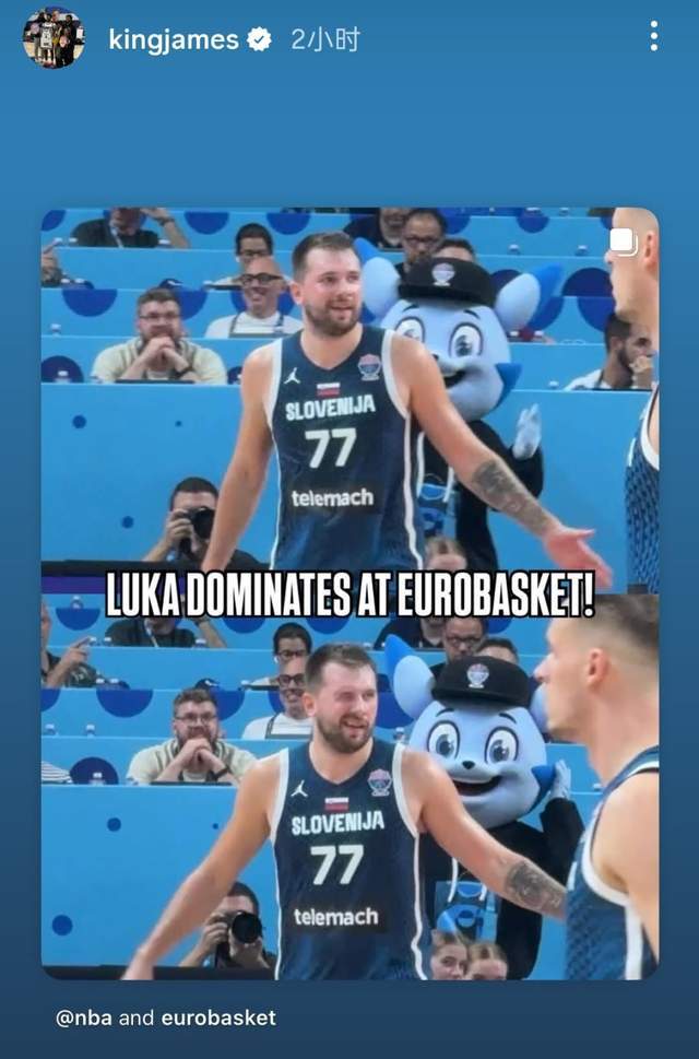 NBA官方社媒晒出东契奇的表现,配图上有东契奇统治欧洲杯的字样,而配文是:“东契奇献上高光表现——狂砍42分10篮板,带领斯洛文尼亚男篮在欧洲杯中获胜!”詹姆斯第一时间点赞并转发了这条社媒,支持自己的湖人队友。