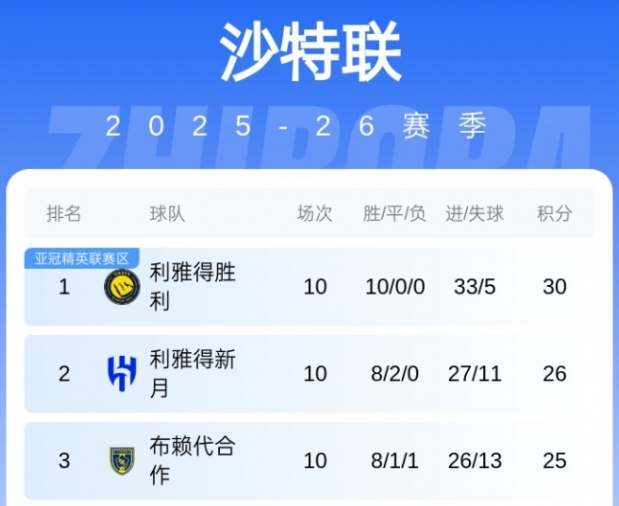 目前利雅得胜利先赛,仅以净胜球优势排在同分的布赖代合作之前,如果本轮布赖代合作拿分,胜利的排名就将降至第3位。
