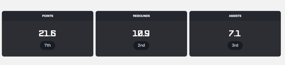 数据方面,申京目前场均21.6分10.9篮板7.1助攻,投篮命中率59.6%,三分命中率37.5%。他的场均得分排名杯赛第7,场均篮板排名杯赛第2,场均助攻位居杯赛第3。值得一提的是,申京是本届欧洲杯目前唯一一位在得分、篮板和助攻三项数据排名都进入杯赛前10的球员。