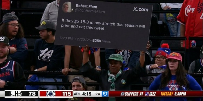 对此,快船主场球迷墙直接晒照点名键盘侠,因一位网友曾表示,如果快船本赛季能够在任意阶段取得15胜3负,他将打印这条推文并吃掉。