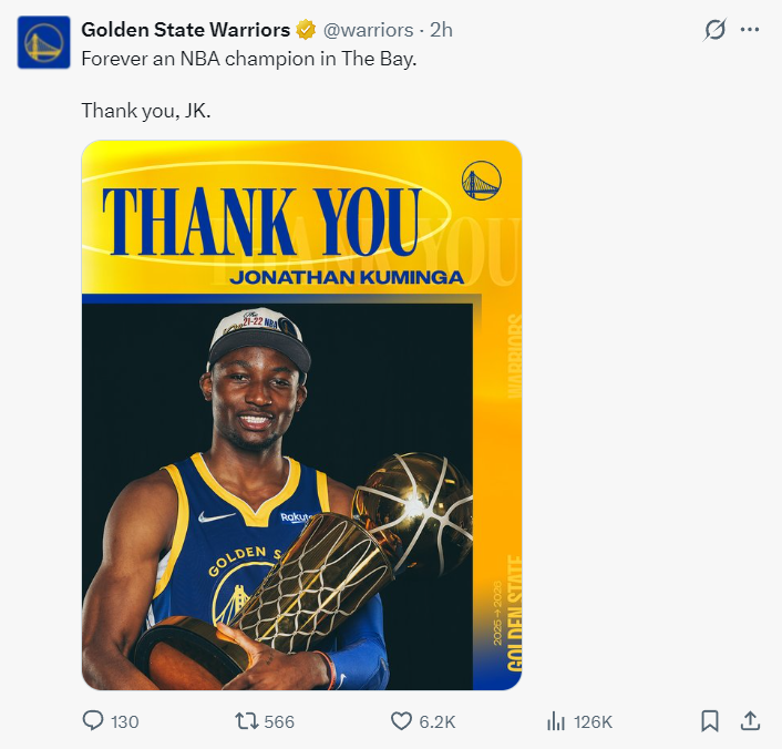 勇士官方也感谢了希尔德、库明加,这两被送到老鹰。